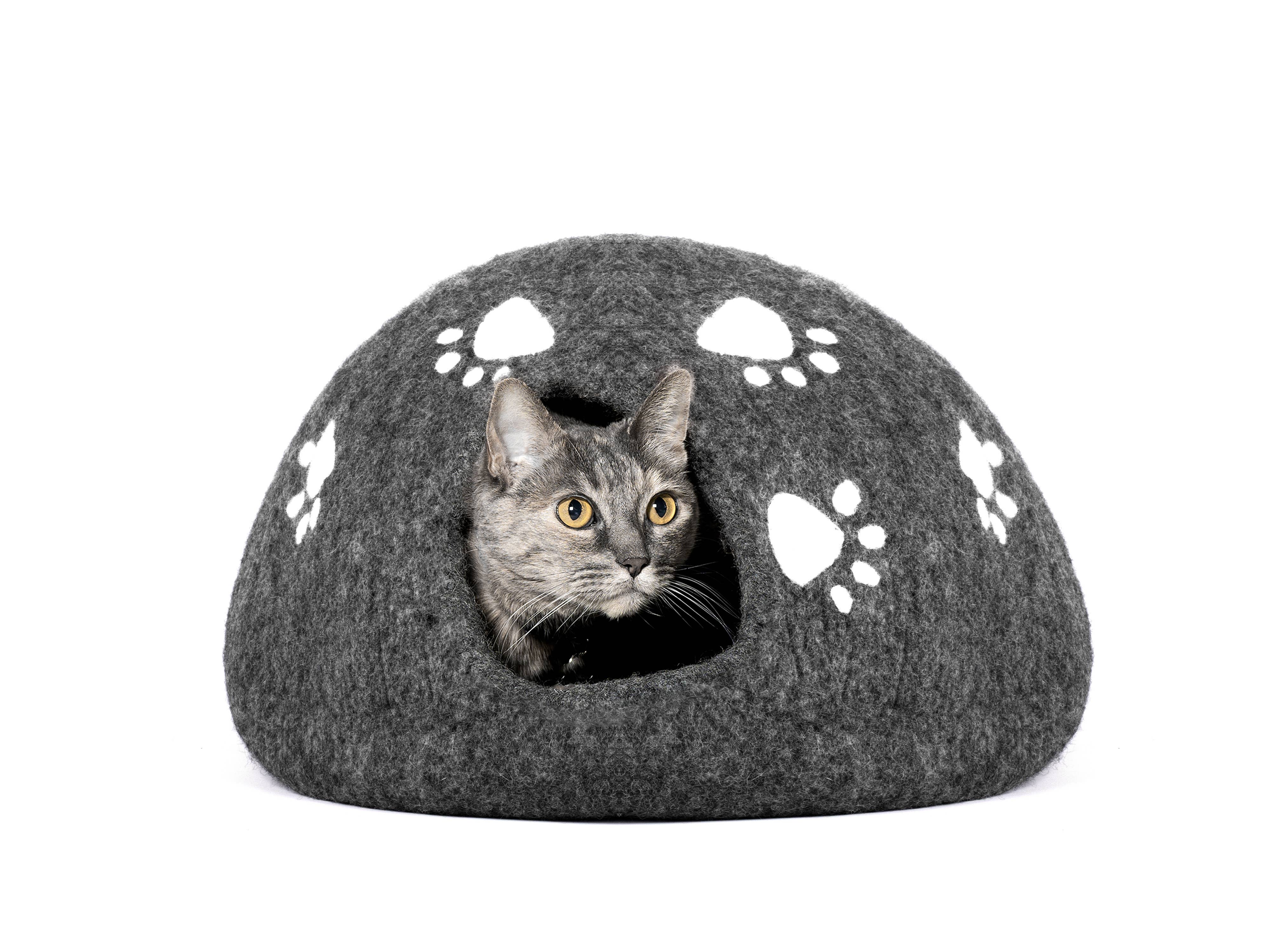 Paws Design Felt Cat Cave - Natural Felt Wool Cat Bed: White Paws on Charcoal