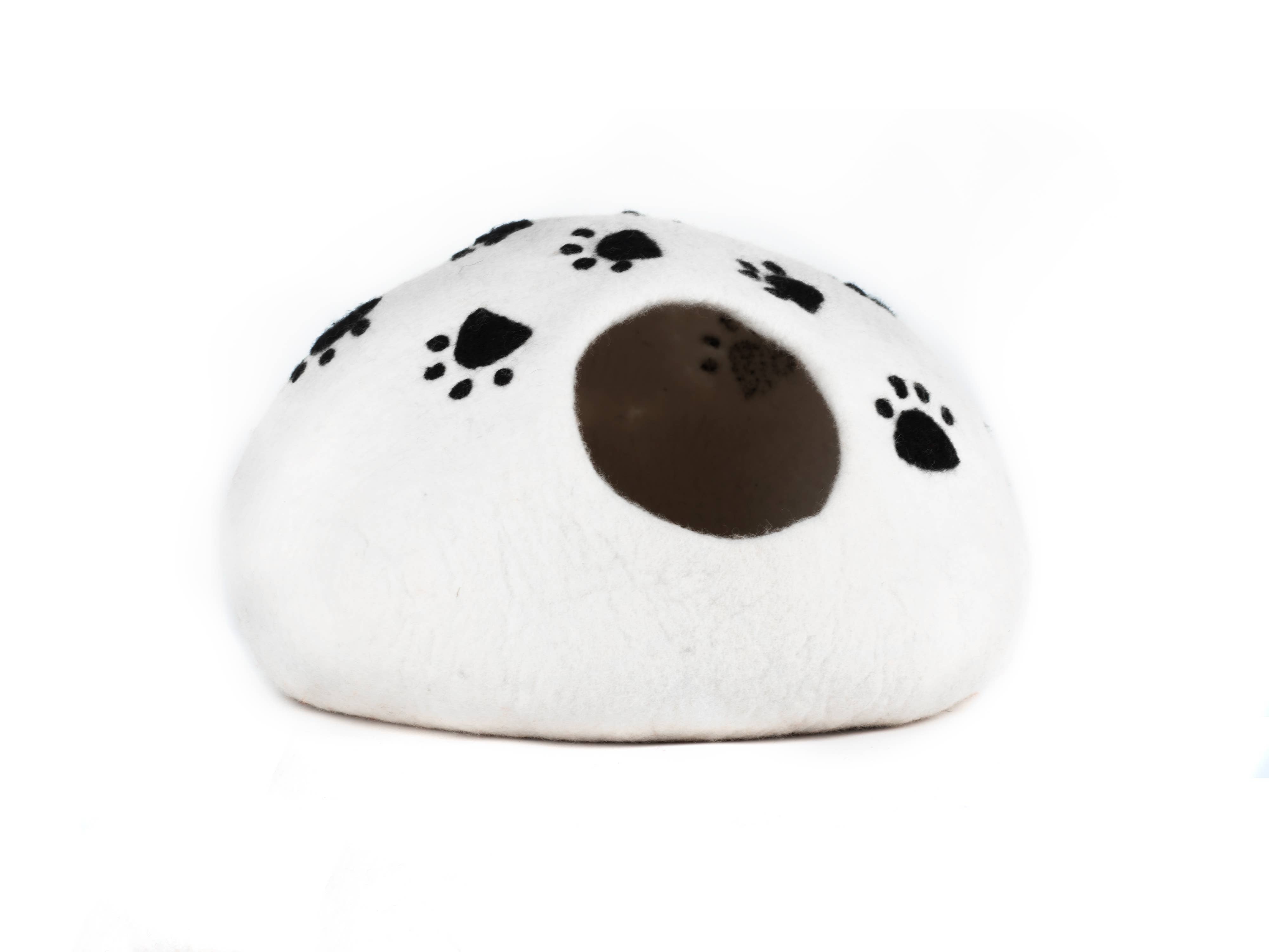 Paws Design Felt Cat Cave - Natural Felt Wool Cat Bed: Charcoal Paws on White